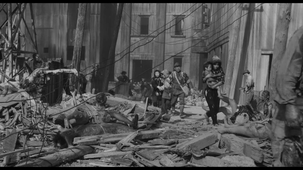 Imamura documenta l’esplosione della bomba atomica a Hiroshima e gli anni successivi attraverso lo sguardo di una famiglia di sopravvissuti: la giovane Yasuko, lo zio Shigematsu e sua moglie Shigeko. L’esperienza è sconvolgente, e il turbamento diventa ancor più intenso perché preceduto da scene di vita quotidiana, montate in successione con asciuttezza, senza alcuna nota di pathos: alcune donne sono intente in una cerimonia; lavoratori si accalcano in un treno; un cane attraversa veloce la strada. Tutto è quiete e silenzio, finché una stanza viene illuminata da un bianco irreale e accecante. È allora che l’esplosione diventa anche suono e le cose precipitano nell’orrore.