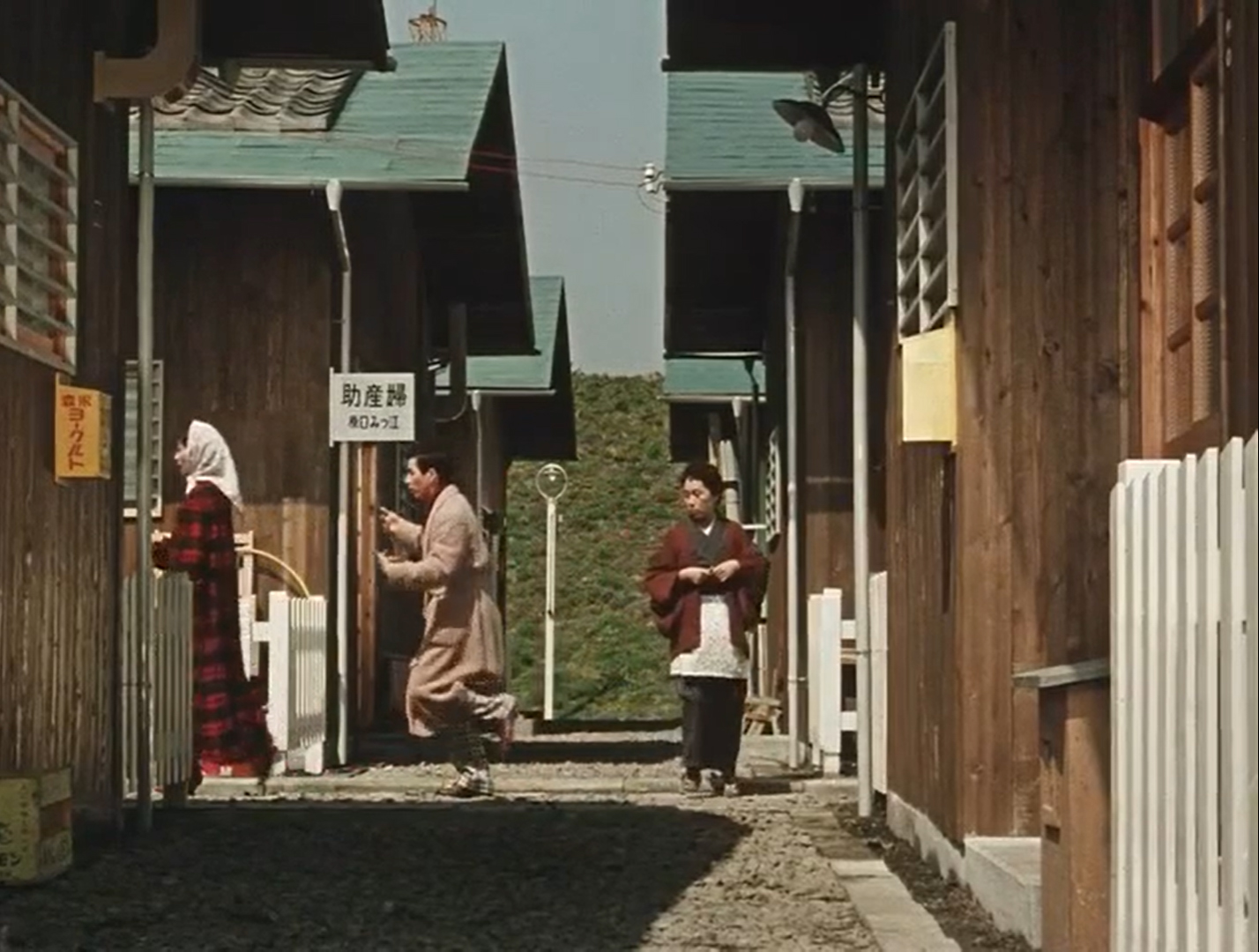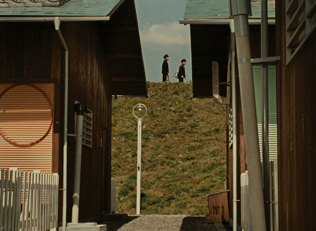 Le piccole case sono attigue (così come lo erano le baracche dei film di Ozu degli anni ’30) e questa circoscrizione spaziale diventa paradigmatica delle piccole ossessioni, delle abitudini e di una mentalità improntata al giudizio e al pettegolezzo. La comunità si sorregge su convenzioni di facciata, formule linguistiche di ostentata educazione (il saluto, il “buon giorno”, l’ospitalità) ma fallisce nel comprendersi a livelli profondi e soprattutto nell’esprimere la sostanza calda e sincera dei propri pensieri ed emozioni. E’ per questo motivo che i due giovani, Heiichirō (Keji Sada) e Setsuko (Yoshiko Kuga), continuano a incontrarsi casualmente senza mai riuscire a confessare il reciproco sentimento, vittime di una inibizione che li contrae in un sorriso sospeso e carico di attese insoddisfatte.