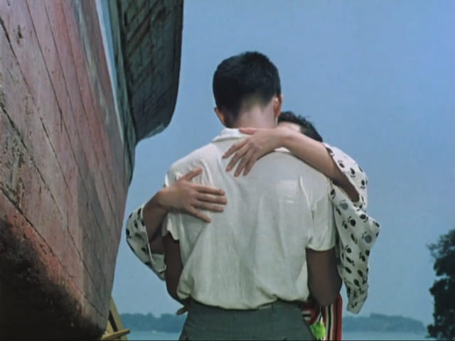 L’altra presenza femminile, la giovane Kayo (Ayako Wakao), è radiosa e dà vita, insieme a Kiyoshi, a una storia d’amore allo stesso tempo pura e passionale, pudica e insopprimibile. Il bacio tra i due giovani, nell’oscurità di un vicolo, tra silenzi e musiche lontane, è quanto di più romantico e sospeso – da indurre un trasalimento – Ozu abbia mai girato: una scena colma di tensione e di ombre, la cui bellezza per sottrazione raggiunge un equilibrio perfetto assieme ai pochi elementi narrativi che Ozu mette in gioco: i suoni, i gesti; pochi passi di lui verso di lei, brevi esitazioni, infine un bacio che scioglie ogni paura. Kayo cinge con la mano la spalla di Kiyoshi, un gesto che si ripeterà in ogni bacio che i giovani si scambieranno nel corso del film. Con quella mano, Ozu ci mostra il desiderio, l’abbandono, la libertà giovanile contro tutte le regole dei padri. Cadono petali di fiori: è la bellezza struggente dell’amore.