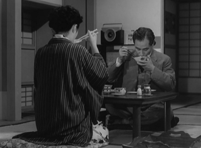 Ma c’è anche uno sguardo alla complessità del matrimonio che Ozu affronta con una grazia a noi occidentali del tutto sconosciuta. In una scena bellissima, moglie e marito si riconciliano durante una cena notturna. Taeko, che ha sempre disprezzato le sue abitudini frugali, si riavvicina a lui con sentimento rinnovato; e si ha l’impressione di avere accesso ai sentimenti più intimi e preziosi. Nei gesti imbarazzati tra i due, in questo condividere un pasto modesto – fatto di riso al tè verde – c’è il senso di un amore che sboccia con l’umiltà di un fiore. Commovente il gesto di Mokichi, che solleva la manica del kimono di Taeko per non farla bagnare: pochi secondi bastano a Ozu per rappresentare cosa sia la cura per l’altro.