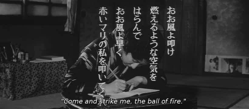 In A Wanderer’s Notebook (1962), il film dedicato a Fumiko Hayashi, poetessa “errante”, Naruse affronta il difficile compito di dover visualizzare “l’immaginazione poetica” della protagonista, il cui rapporto col mondo trova nella scrittura il legame più profondo. Il regista sceglie di sovraimprimere direttamente i versi sull’inquadratura (foto 6): la parola si fa immagine grafica del pensiero, pronunciato verbalmente da un voice over. Si tratta di una soluzione apparentemente semplice ma di grande modernità, che dà allo spettatore accesso immediato ai pensieri di Fumiko. Tutto ciò non è dissimile dalla visione di Emily Dickinson che considerava la poesia, una volta stampata, “corporea illustrazione”. Il regista Jim Jarmusch adotterà un procedimento simile nel film Paterson (2016).