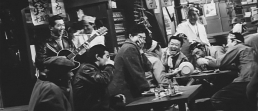 In The Angry Street (1950) il club è una sala da ballo all’americana, dove il giovane Sudo può esprimere tutta la sua rabbia in una dissoluta voracità sessuale e sfruttamento economico delle amanti. In questo caso, il locale è figura retorica di un paese stravolto dall’occupazione americana. I corpi ballano lo swing, ma l’amore, il romanticismo sono sostituiti da mera sopravvivenza e percezione di alienazione. I chiaroscuri guardano allo stile dei noir hollywoodiani; le ragazze sono vestite all’occidentale, i rapidi e invisibili cuts sui personaggi ambigui delineano un racconto morale all’interno dei codici di genere: il regista denuncia l’incrinatura, ma anche la colonizzazione dell’immaginario provocata dalla presenza americana.