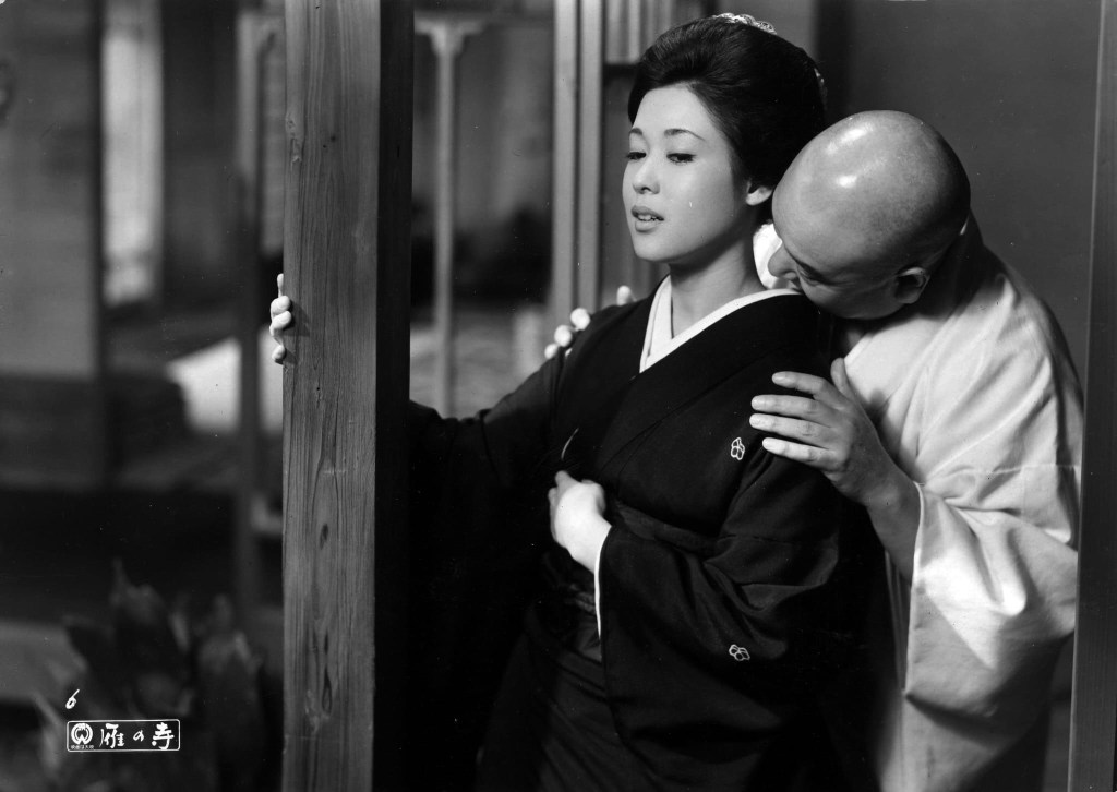 La giovane Satoko è oggetto di inquadrature ravvicinate che si insinuano nel suo volto, cercando di interrogarne i pensieri. Satoko ci appare come una corrente calda e tumultuosa celata in una calma apparente: abile nel dissimulare i propri sentimenti, e solo apparentemente rassegnata al proprio destino di “oggetto” passivo, la ragazza è uno spirito resistente e vivo. Persino quando si abbandona, per sopravvivere, agli impulsi sessuali del lascivo monaco Jikai, riusciamo a percepire l’onda travolgente delle sue inquietudini dietro una maschera di cortese sopportazione. Ancora una volta Ayako Wakao dà corpo a una figura femminile irrisolta e moderna, dotata di un istinto alla libertà, mai assuefatta al ruolo di vittima in un contesto di abiezione.