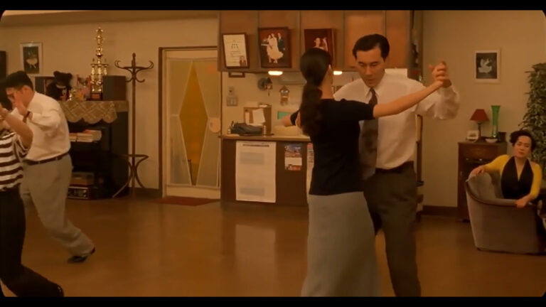 Diretto da Masayuki Suo, il film è incantevole sin dai primi minuti, nel suo porgersi gentile allo spettatore. Un primo piano si posa sul verso shakespeariano che campeggia sopra il palco di una grande sala da ballo: Bid me discourse, I will enchant thine ear; poi la macchina da presa fa una panoramica sui ballerini, quasi danzando con loro, mentre una voce fuori campo spiega la mentalità giapponese nei confronti del ballo, guardato con sospetto: “In un paese in cui le coppie non camminano mano nella mano e ancor meno dichiarano “ti amo”… l’idea di abbracciarsi e ballare in pubblico è troppo imbarazzante e guardata con vergogna.” Una mentalità che Naruse esprimeva con chiarezza nel film Angry Street (1950), in cui le ballrooms erano il luogo della corruzione, della perdita dei valori e della purezza, e sede di una lascivia importata dall’occupazione americana.