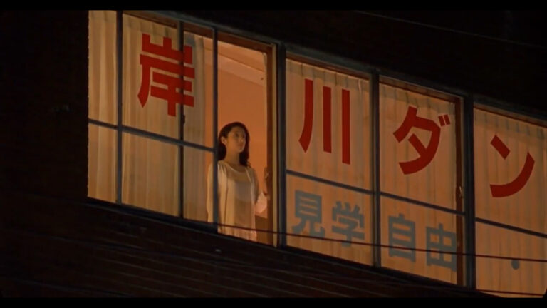 Sugiyama’s days unfold in monotonous repetition, suspended between home and office, within an apparent framework of “success,” yet his gaze is veiled with melancholy. His role is purely economic; family conversations are brief and devoid of meaning, just as dry and habitual are his hours as an employee. The nightly train he boards, with its lateral glimpses of the illuminated city and the seduction of another life flowing beyond the window, pushes him to defy his predetermined fate. In Mai’s face, Sugiyama finds a dream to cling to: his eyes grow restless, and the moment of passing by the dance school becomes the only authentic and meaningful instant of his existence.