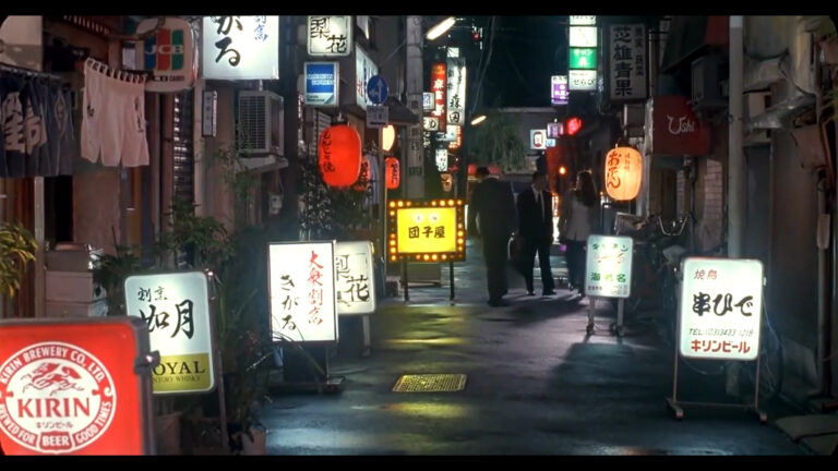 With delicacy and restraint, Suo subverts this traditionalist vision (while remaining deeply connected to classical cinema) and creates a beautiful synthesis between different cultures—Eastern and Western—reaching the very core of human needs: dream and desire. This ideal conjunction is already contained in the original title, which blends English and Japanese into a single dance step: “Shall we ダンス?” It is also present in the film’s opening, suspended between internationalism (the initial waltz, filmed in long circular takes) and the distinctly Japanese particularism of a narrow alley lined with bars, framed frontally.